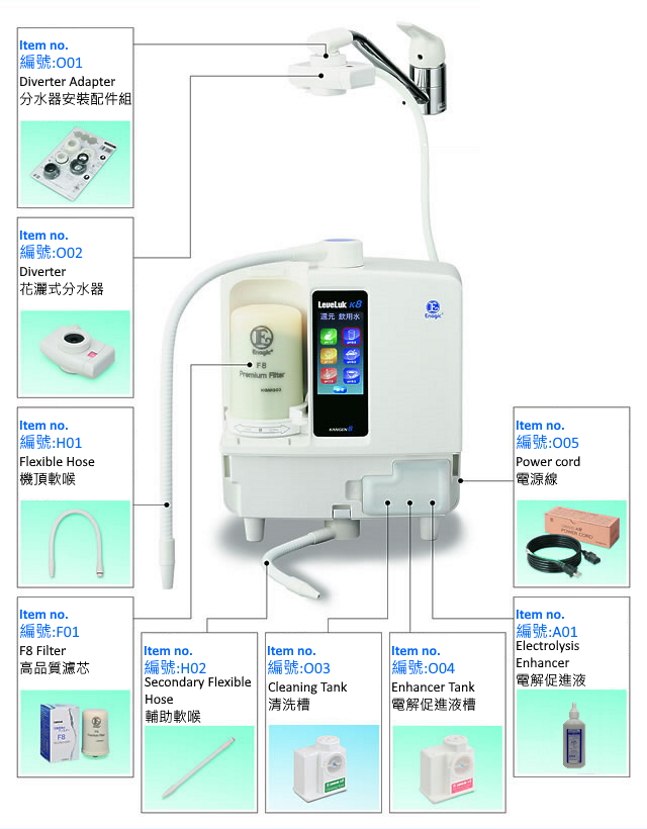 - 帶有清晰、易讀的觸碰屏,操作簡單。以大型液晶顯示器及聲音作出提示擁有清晰,易讀、大型顯示屏以及聲音提示生成之功能水(生成中的還原水、酸性水、強酸性水、純淨水),跟其他資訊。操作簡單。引進觸碰屏幕大大提升操作