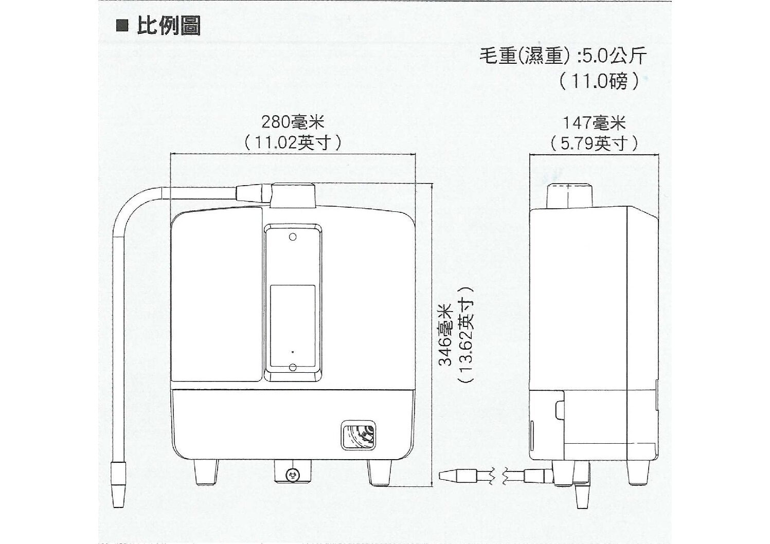 ※按下強酸性水按鍵時,強酸性水從灰色出水管流出,同時強還原水從軟式導管流出。