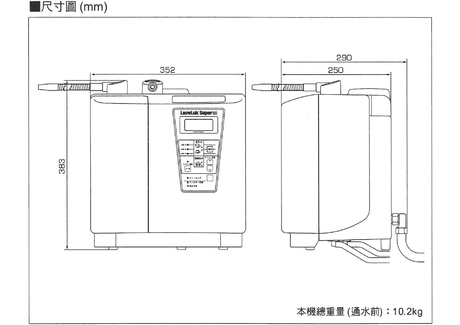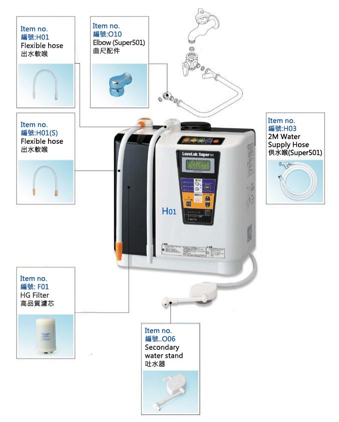 - 電解槽由7層+5層電解板組成還原水、美容水電解槽由5層鈦鍍白金電解板組成,強酸性、強鹼性電解槽由7層鈦鍍白金電解板組成,功能強大。能穩定生成ORP由+1130mV至-800mV之電解水(因選擇之生成水及自來水而不同)。
